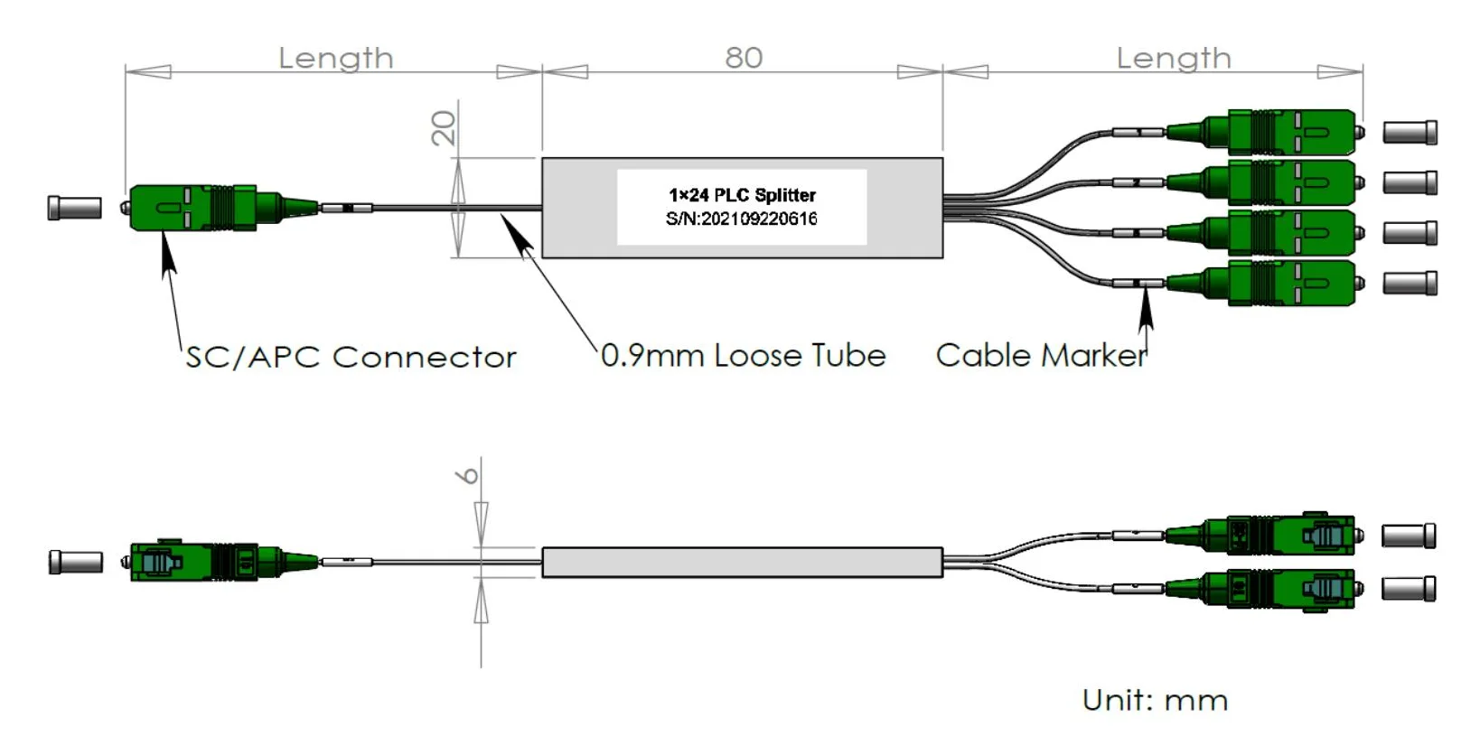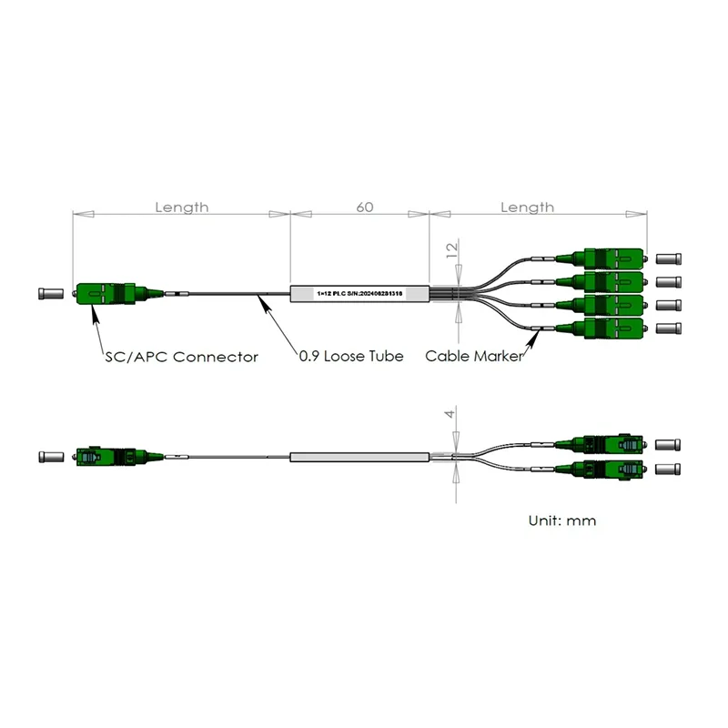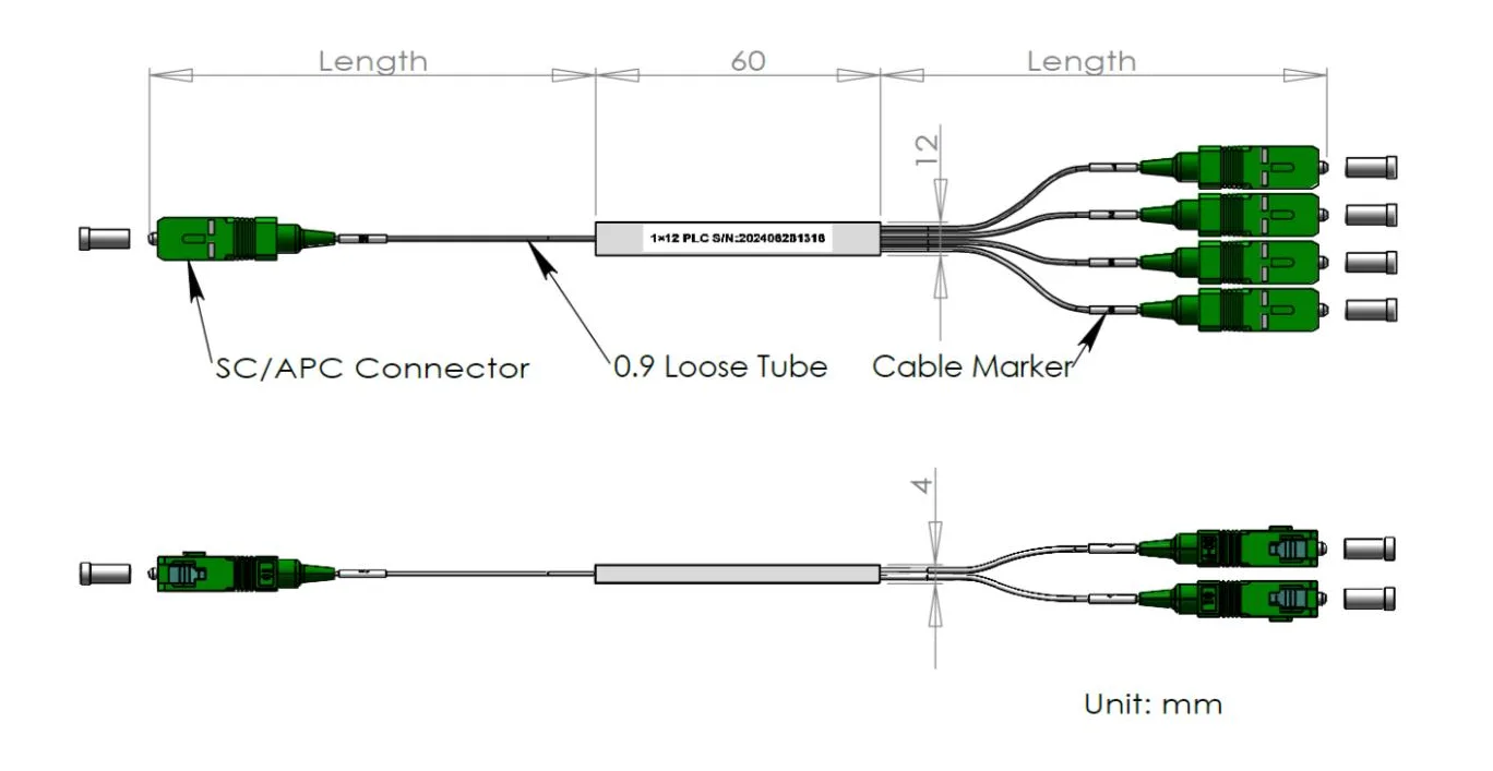 Pecyn tiwb dur holltiad 1x12/1 × 24 PLC 60x12x4 a 80x20x4mm, gyda thiwb rhydd 900μm 1.0+0.1/-0m, cysylltydd SC/APC.