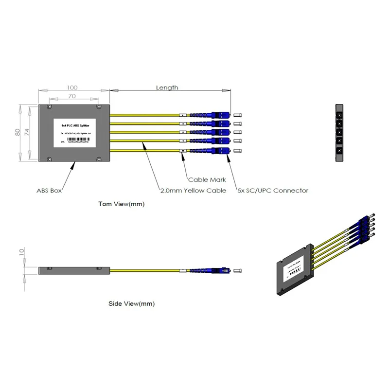 Pecyn hollti casét cylched tonnau golau planar 1x4 100x80x10mm, φ2.0 hyd cebl PVC melyn 2.0 +0.1/-0m, 5pcs SC/Cysylltydd UPC.